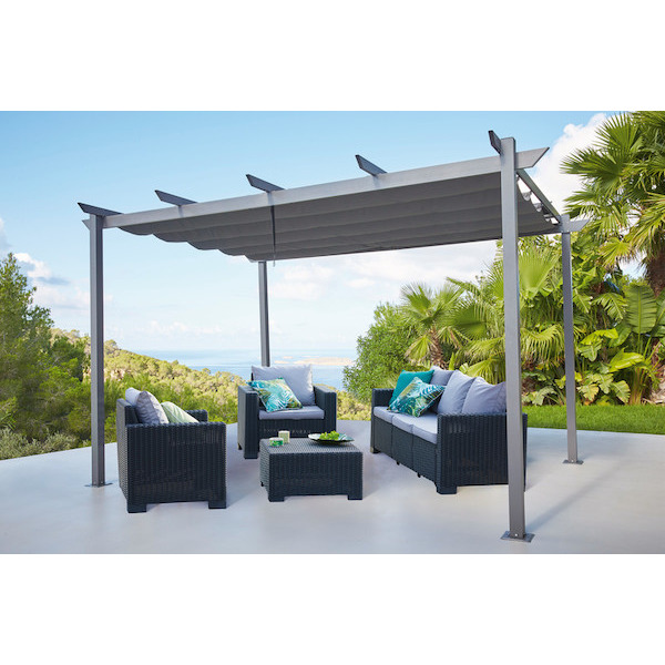 Optez pour le toit rétractable de la tonnelle Lorca, une solution pratique et esthétique pour créer une ambiance ombragée dans votre jardin ou sur votre terrasse. Ce toit vous permet de moduler l'ensoleillement selon vos besoins et de profiter pleinement de vos espaces extérieurs par tous les temps. Grâce à sa conception ingénieuse, il s'adapte facilement à votre pergola Lorca 4x3m gris HYBA pour vous offrir un confort optimal. Savourez des moments de détente à l'ombre en toute simplicité avec la tonnelle Lorca.