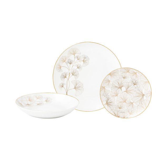 service 18 pièces assiettes carrefour home - Service vaisselle "Ginko" 18 pièces En porcelaine. Comprenant : 6 assiettes plates Ø 26 cm, 6 assiettes creuses Ø 20 cm et 6 assiettes dessert Ø 19 cm. Ne convient pas au lave-vaisselle et ni au micro-onde. .