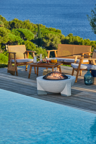 Matière magnésie et métal. Dims : 73,5 x 73,5 x 45 cm. Dims foyer : Ø 55 cm. Esthétique et convivial pour vos soirées d'été. Vendu avec une grille foyère; un couvercle pare-feu et un tisonnier. -