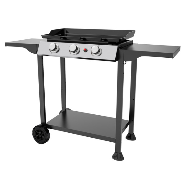 Plancha gaz à poser. 3 bruleurs inox puissance totale 7,5 kW. Plaque de cuisson en acier émaillée 63 x 36 cm. Récupérateur de graisse intégré. Allumage piezzo mécanique.