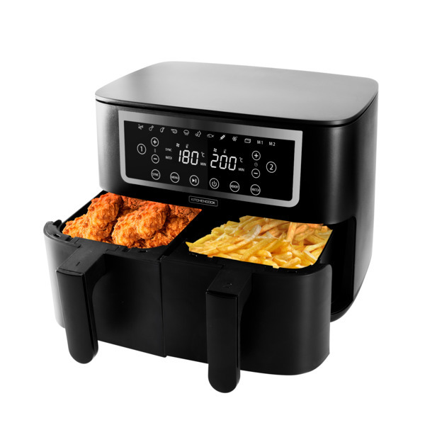 Capacité 2 paniers de 4 l, 10 programmes : frites, poulet, steak, crevettes, gâteau, légumes, poisson, brochettes, surgelés, tofu. Thermostat réglable, minuterie, puissance 2600w