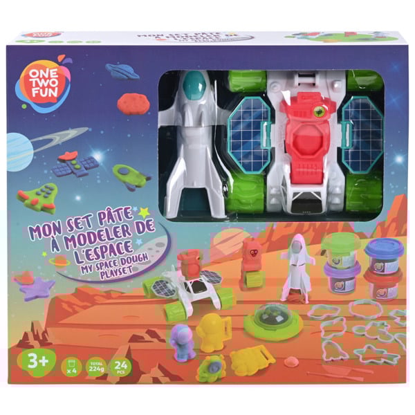 Super set de pâte à modeler sur le thème de l'espace comprenant de la pâte, de nombreux moules, un rover lunaire et une fusée. Inclus 4 pots et 20 accessoires dont 2 vaisseaux.