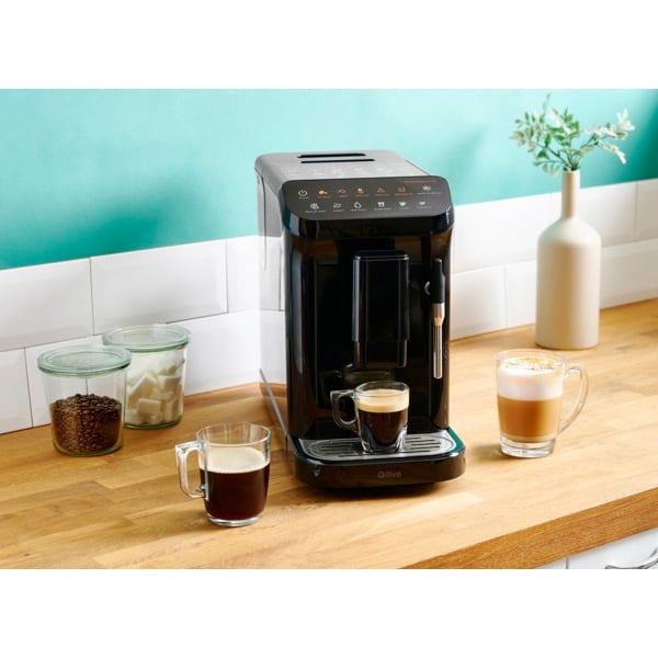 1350W, pression 20 bars, 15 niveaux de mouture, réservoir d'eau 1.5L, buse vapeur, écran tactile, programmes disponibles : Espresso, Lungo, Americano, eau et vapeur chaudes.