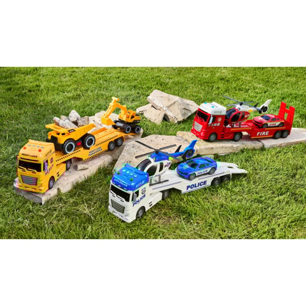 Camion Friction qui transporte deux véhicules roues libres. Sons et lumières sur le camion et un véhicule transporté. Existe en modèle Pompier, Police et construction. 6 piles AG13 incluses.Réf. 500934 - - Dès 3 ans.