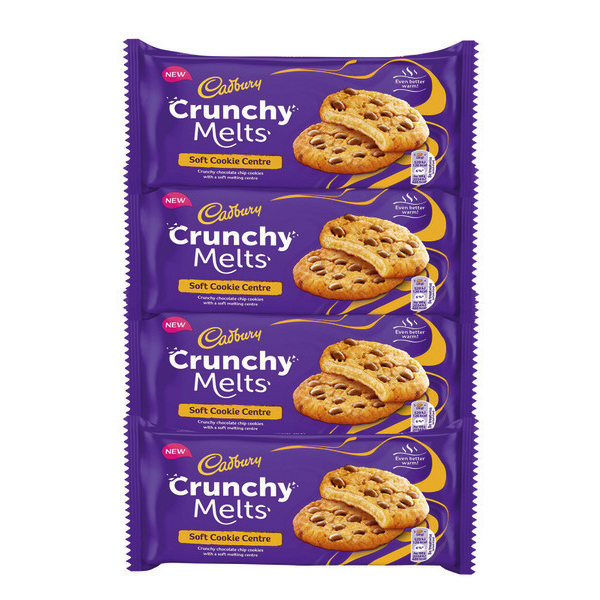 Goûtez aux délicieuses barres de chocolat Cadbury - Cookies Crunchy Melts - disponibles en boîte de 4 x 156 g. Savourez le mélange parfait entre un coeur fondant ou un coeur chocolat qui vous procurera une expérience gustative inoubliable. Fondantes à l'intérieur et croustillantes à l'extérieur, ces gourmandises sauront combler toutes vos envies de chocolat. Succombez dès maintenant au goût irrésistible de Cadbury !.