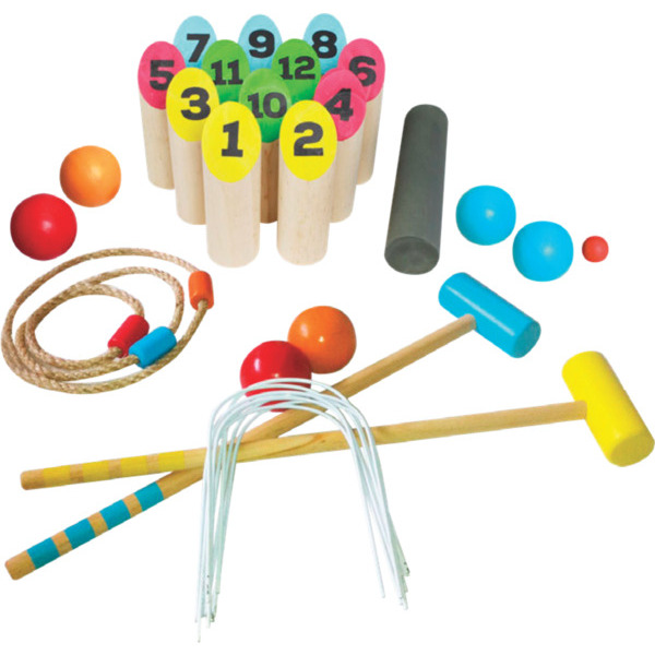 Composé de 3 jeux en bois FSC : quilles nordiques couleurs, croquet en bois, lancer d'anneaux avec anneaux en corde. - Offre valable du 19/03/2024 au 14/04/2024.