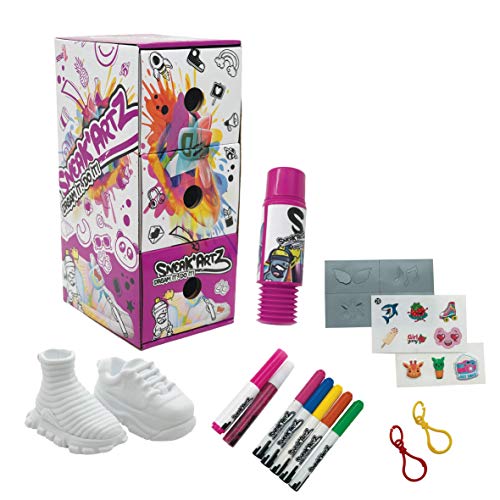 3700514322212 Ce superbe coffret Sneakartz te permet de personnaliser entièrement deux baskets et de les faire à ton image !,Ouvre vite les trois tiroirs pour découvrir les modèles de baskets que tu as obtenus et tous les accessoires pour les personnaliser : feutres, pochoirs, charms, etc. !,Place à la création ! Transforme ta chaussure blanche en une véritable œuvre d’art ! Colorie-la, décore-la et emmène-la partout grâce au porte-clé inclus ! Chaque recoin est personnalisable !,Collectionne les 24 modèles de baskets aux styles variés et toujours tendances !,Contenu : 2 chaussures blanches de 10 cm + 5 charms + 5 feutres effaçables + 1 feutres à paillettes + 1 feutre à formes + 4 pochoirs + 1 spray + 3 feuilles de stickers + 2 porte-clés + 1 poster de collection