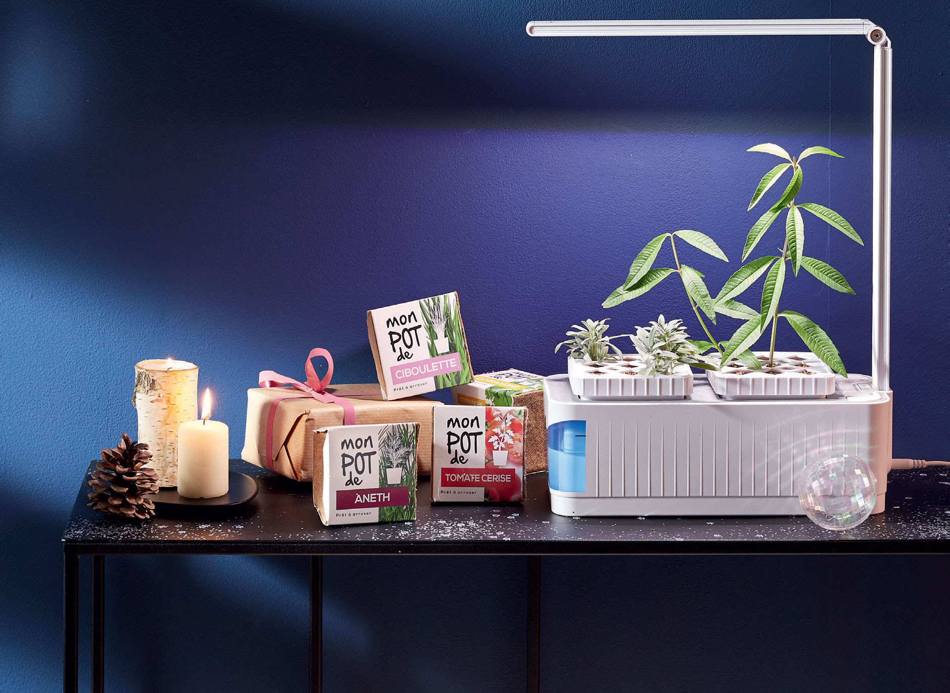 Fonctionne avec lumière LED, 1 bassin et 2 pots de plantation En ABS et alliage d'aluminium Coloris : blanc Existe aussi différentes variétés de graines au choix pour jardin d'intérieur : tomate, aneth, ciboulette ou coriandre à 1.99 €.