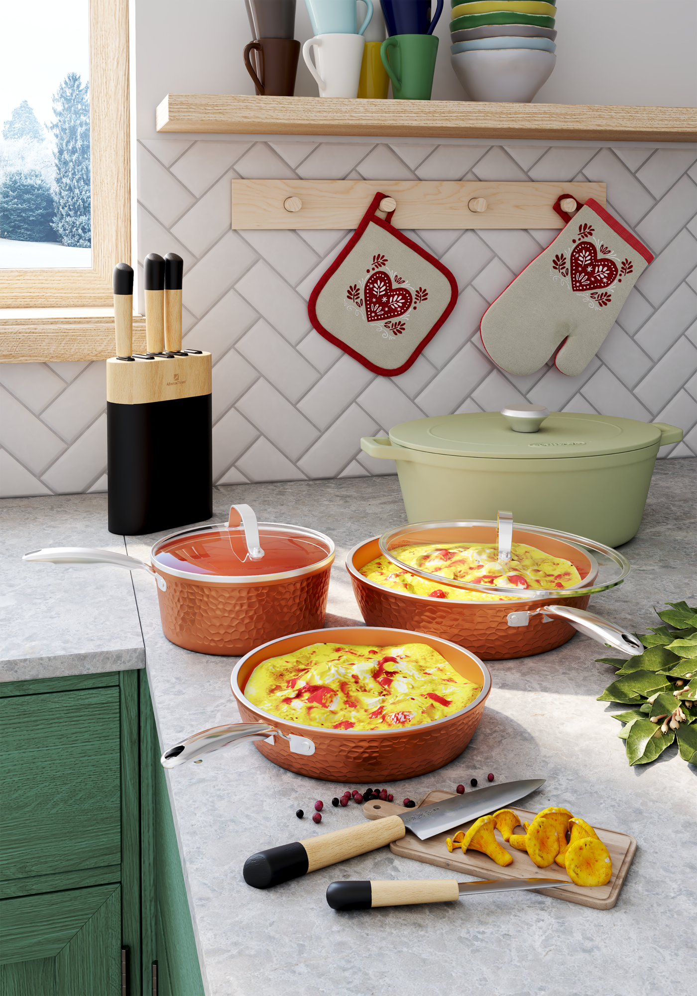 En aluminium effet martelé et revêtement céramique. Le set comprend : une poêle 20 cm, une poêle 25 cm avec couvercle en verre, une casserole 2L avec couvercle en verre..