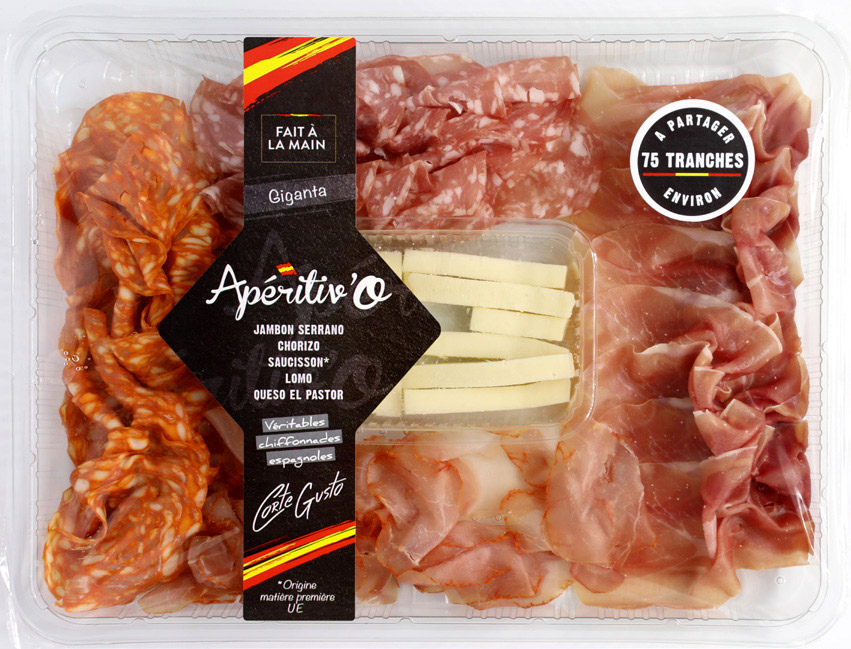 Composé de Jambon cru, Coppa, Speck, Saucisson, Olives et tomates séchées. 340 g. Le kg : 23,50 €. Au rayon frais emballé.