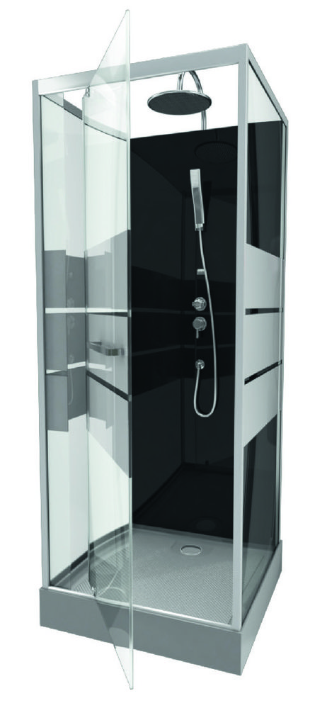 Leclerc CABINE DE DOUCHE CITY 90(1) Dim. : L. 90 x H. 219/230 x P. 90 cm. Receveur en acrylique renforcé. Fermeture magnétique. Poignée porte serviettes noire. Douche de tête anticalcaire réglable en hauteur, douchette anticalcaire flexible inox et mitigeur sélecteur. Porte pivotante en verre sécurité : ép. 5 mm. Montage sans silicone. Fond en verre de sécurité : ép. 4 mm. Hauteur de montage nécessaire 230 cm.