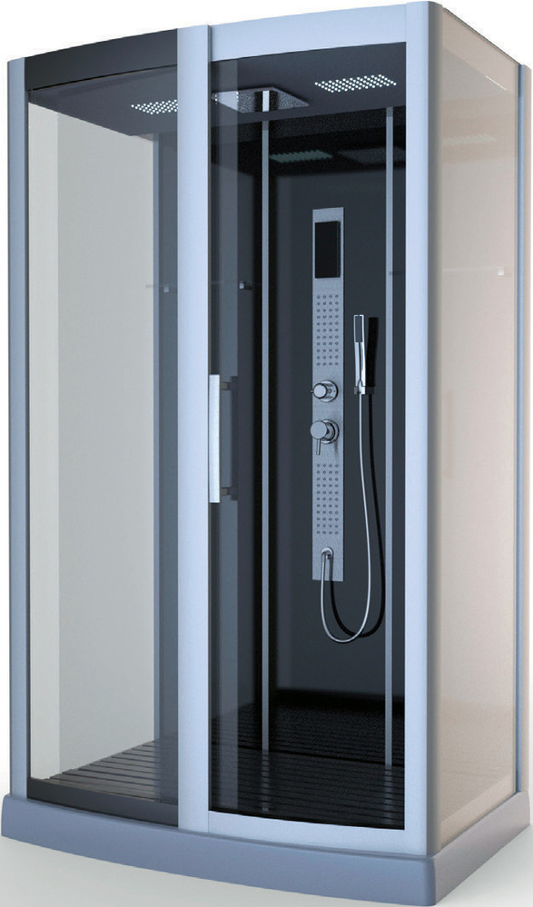Panneau d’hydromassage multijets anticalcaire. Porte coulissante verre de sécurité fumé 6 mm, fermeture magnétique. Tête de douche, douchette à main anticalcaire, mitigeur mécanique, 2 étagères en verre noir, 1 radio FM avec panneau de contrôle tactile et bluetooth, éclairage LED, 1 extracteur de vapeur. Garantie constructeur* 2 ans pièces. Vendu sans caillebotis.