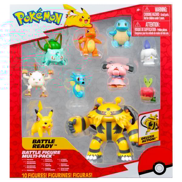 9 figurines de 5 cm (Pikachu, Riolu, Evoli, etc.) et 1 figurine de 12 cm (Carchacrok). Réf. 690494 - - Dès 4 ans.