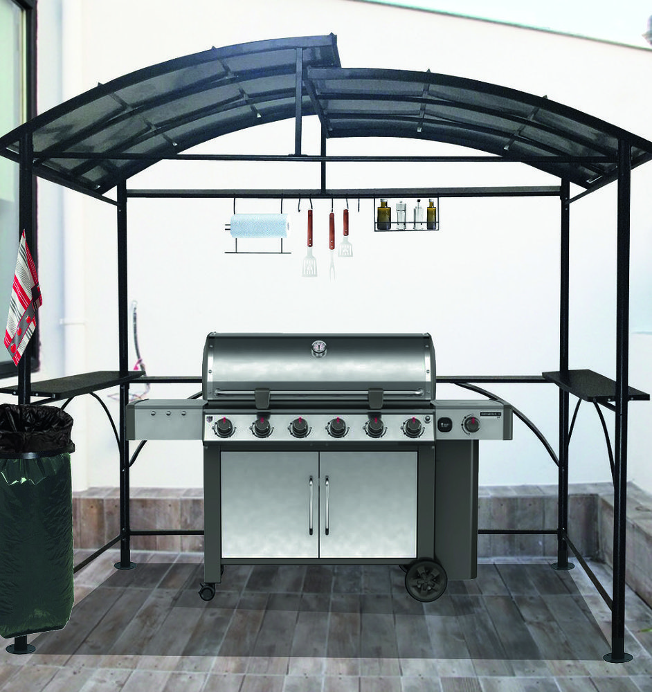 Carport barbecue autoportant à double toit finition époxy gris anthracite - En acier. Dim. hors-tout(1) : L. 263 x P. 150 x H. 232/240 cm env. Comprend 4 pieds réglables. Livré avec plusieurs supports. À monter soi-même. Garantie constructeur 2 ans. Fourni avec ses accessoires qui comprend : un porte tablier, cinq crochets pour accrocher vos ustensiles , deux tablettes latérales ainsi que d'autres éléments il vous aménera un confort de mouvement qui vous permettra de réaliser de merveilleuses grillades durant l'été. De plus il s'adaptera parfaitement à votre extérieur et vous garantira la protection de votre barbecue par tous les temps grâ ce à son toit réaliser en acier galvanisé .