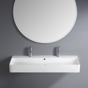 Double vasque à suspendre en céramique, avec plage de robinetterie.