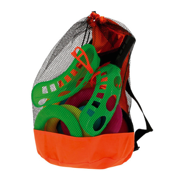 Sac de plage en nylon 30 x 40 cm. Contient : 1 disque volant, 1 jeu d'anneaux, 1 lance balle, 1 jeu de raquettes scratch et 2 balles. .