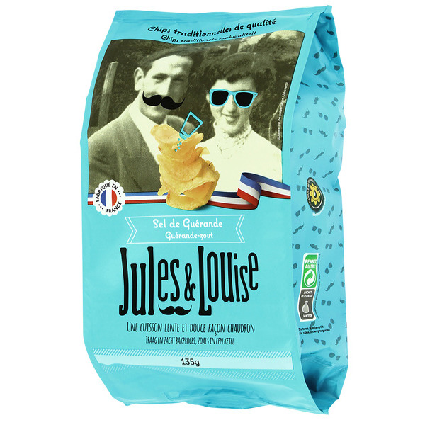 Savourez les délicieuses chips JULES & LOUISE, avec leur assortiment de saveurs uniques. Faites votre choix parmi les délicates saveurs de Sel de Guérande, Sel & Poivre, Barbecue ou Vinaigre de cidre. Le panachage entre les différentes variantes est possible pour encore plus de plaisir gustatif. Succombez à cette tentation croustillante et savourez chaque bouchée de ces chips de qualité. Une explosion de saveurs dans un format de 135 g, idéal pour toutes les occasions..