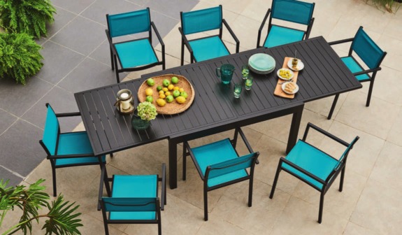 En aluminium - Textilène 2 x 1 Dim. : 54 x 55 x 80 cm Coloris : Structure noire mate - Textilène bleu pétroleDU 9 AU 21 JUIN.