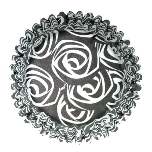 motif roses blanches imprimées sur fond noir. Taille standard 5 cm au fond et 3,5 cm de hauteur. A utiliser avec un moule à cupcakes..