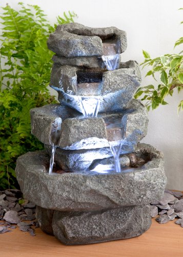 Fabriquée à partir d'une résine résine imitation pierre, résistante au gel et aux UV pour une durée de vie optimale Entièrement autonome, aucun réservoir supplémentaire nécessaire 3 lampes à LED répartie sur 3 étages différents Convient pour une utilisation en extérieur Fabriquée à partir de polyrésine.