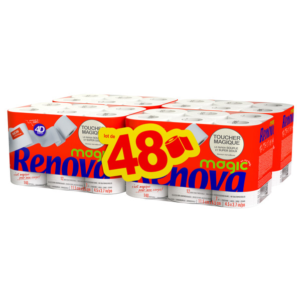 Dorlotez-vous avec le papier hygiénique RENOVA - Magic. Ce pack de 48 rouleaux vous garantit une expérience premium. Avec sa douceur exceptionnelle et sa résistance, RENOVA sera votre allié quotidien pour un confort incomparable. Offrez-vous le meilleur et faites confiance à RENOVA..