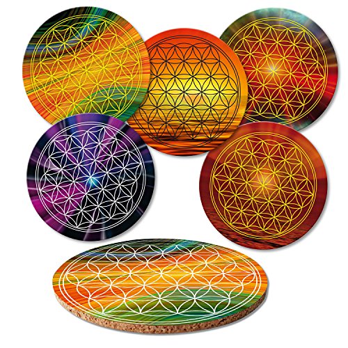 ADDIES 'ADDIES Dessous de Plat 6 pièces Set "Fleur de vie en verre de qualité boîte cadeau transparente et dos en liège, rond, 6 motifs différents, M de 4 ? Avant d'effectuer votre achat, Zounko