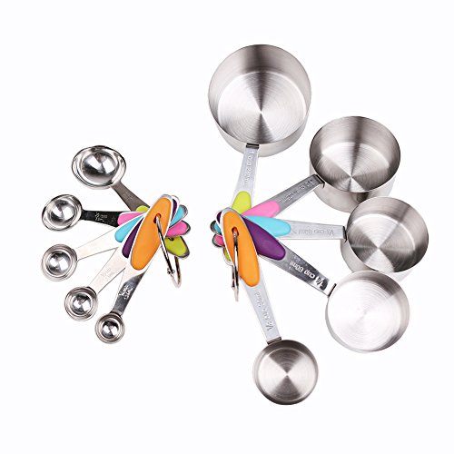 5 CUP TAILLES - Mesure de la bonne quantité de lait, l'huile, l'eau, les sirops, les pâtes, le riz, les noix ou n'a jamais été aussi facile. Obtenez les mesures précises pour vos recettes délicieuses avec l'aide de la cuisine de tasses à mesurer. Les quatre tasses dans l'ensemble disposent d'une 1/8 tasse, 1/4 tasse, 1 / 3cup, 1 / 2cup et 1cup. Pour votre commodité, les équivalents métriques britanniques pour ces mesures sont 30ml, 60ml, 80ml, 125ml et 250ml. 5 TAILLES SPOON - écopes viennent en 5 tailles, 1 / 4TSP, 1 / 2tsp, 1tsp, 1/2 cuillères à soupe, 1 cuillère à soupe pour vous aider à mesurer vos épices commodément. Les équivalents métriques britanniques pour ces mesures sont pour empêcher vos épices exotiques sont contaminés par l'humidité des doigts 1,25 ml, 2,5 ml, 5 ml, 7,5 ml, 15 ml. Cuillère de mesure. La forme de la cuillère, il est facile de creuser dans vos petits pots d'épices. BECS POUR POUR LIQUIDES FACILEMENT - Chacune des tasses à mesurer de l'ensemble dispose de deux becs sur les deux côtés pour vous aider à verser des liquides sans répandre une goutte sur le sol ou une table. Laissez pas de gâchis tout en versant de l'eau, le lait, les huiles ou tout autre liquide à poêlons. SILICON POIGNEES POUR UN GRIP OPTIMISE - La poignée anti-dérapant silicium des tasses à mesurer et cuillères optimise l'adhérence en vous offrant la commodité dans votre travail. Surtout la propriété résistant à la chaleur des poignées de silicium des tasses vous permet de verser des soupes chaudes, les sauces, les sirops sans mitaines ou des gants. Faite en inox - Le 10-peice tasse à mesurer ensemble est fabriqué en utilisant robustes en acier inoxydable de haute qualité qui est BPA. Aucune intoxication due à des éléments toxiques dans les cuillères ou des tasses de nourriture. Nous vous offrons une plus belles tasses de qualité et de jeu de cuillère pour mesurer les ingrédients, des rations sèches, les huiles et autres liquides, avec une promesse de durabilité..