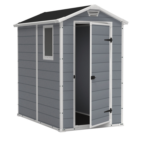 Dim. Extérieur : 130 x 192 x 198 cm. Abri de jardin en résine de synthèse. Double paroi, plancher de sol, 1 porte cadenassable (cadenas non fourni), 1 ventilation, 1 fenêtre. Montage facile. .