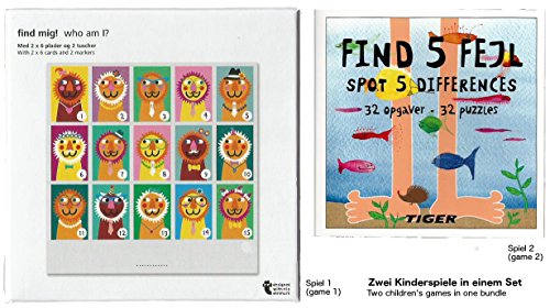 Deux jeux pour enfants en un seul paquet. Jeu 1: Qui suis-je? Est un jeu pour deux. On y trouve une figure sur une carte à jouer et tente de deviner le caractère de l'adversaire par des questions. Contenu: 2 x 2 cartes et feutres. Dimensions: 16 x 16 x 3,5 cm Jeu 2: Spot 5 différences. Le jeu est sous forme de livre. Vous avez 32 images où vous trouverez 5 Déviations. Contenu: Réserver 13 x13 x 0,5 cm. Idéal pour la maison et sur la route..
