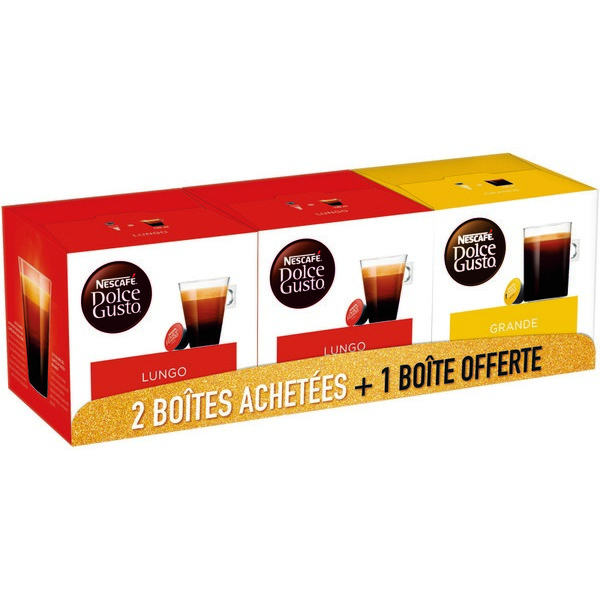 Achetez dès maintenant les nouvelles capsules de café Nescafé Dolce Gusto dans un lot de 2 boîtes lungo plus 1 gratuite. Avec un poids total de 352 g, ces capsules offrent un café de qualité exceptionnelle. Disponibles en différentes variétés et grammages, à des prix variés, choisissez celle qui vous convient le mieux (A). Savourez l'intensité et l'arôme incomparables du café Nescafé avec ces capsules pratiques et faciles à utiliser. Ne manquez pas l'occasion de vivre une expérience café unique avec Nescafé Dolce Gusto..