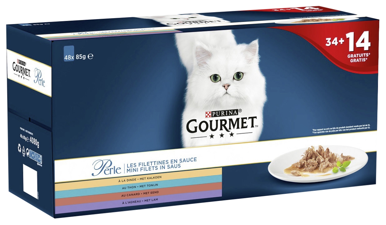 Goûtez aux délicieuses filettines en sauce Gourmet, la promesse d'un véritable festin pour votre palais ! Vous serez séduit par ces petites bouchées de bonheur, préparées avec soin à partir de légumes frais. Profitez de l'offre exceptionnelle de 34 x 85 g + 14 boîtes gratuites, soit 4,08 kg, à seulement 3,10 € le kg. Succombez à la qualité irréprochable de Gourmet et offrez à votre chat une expérience gustative incomparable..