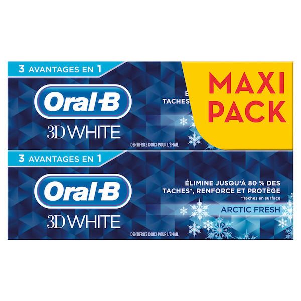 Artic Fresh ou Vitalize ou Pro-Expert menthe extra forte, nettoyage intense, sensibilité et blancheur, 2 x 75 ml. ral-B Le dentifrice Arctic Fresh 3D White rassemble 3 avantages en 1 seul dentifrice : il blanchit, renforce et protège vos dents. Sa formule douce pour l\u2019émail élimine en douceur les taches en surface pour révéler un sourire magnifique et l' arôme menthe arctique vous procure une haleine fraîche longue durée..
