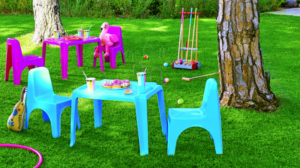 Comprend : 1 table de dim. : L. 66 x l. 51 x H. 43 cm env. et 4 chaises de dim. : L. 31 x l. 40 x H. 51 cm env.