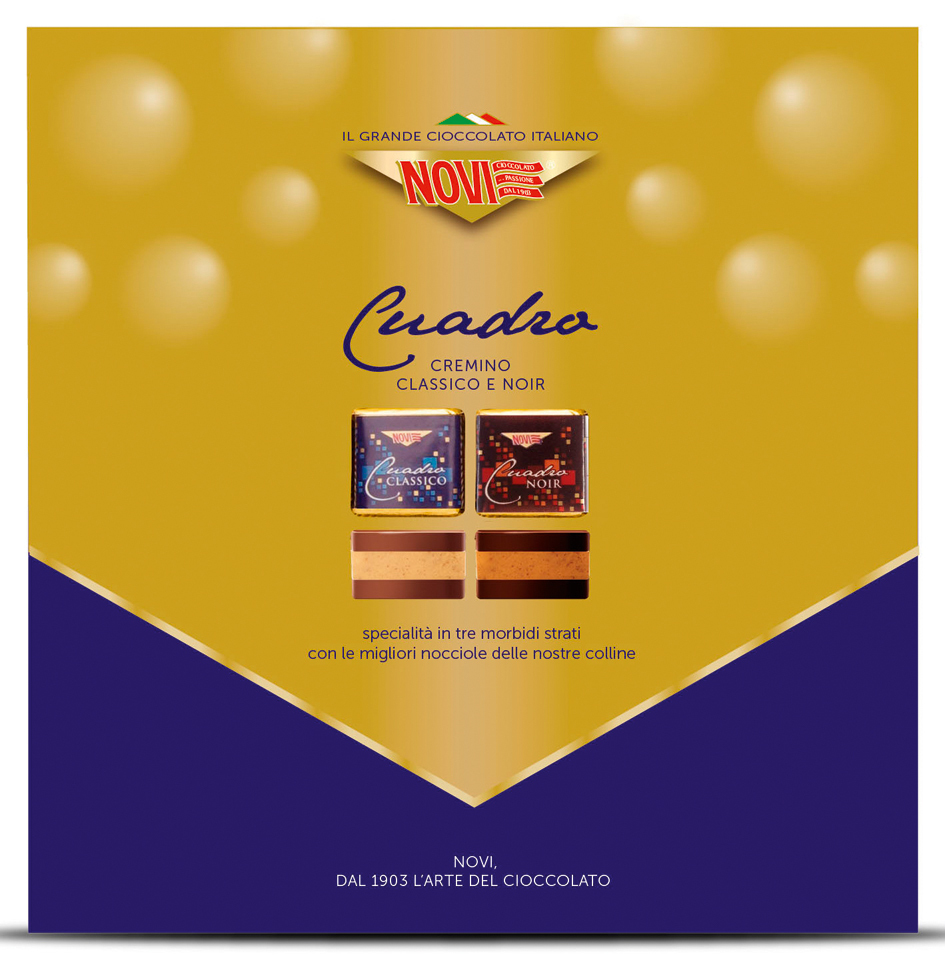 Succombez à la délicieuse tentation de Novi - CHOCOLATS Cuadro. D'une intensité inégalée, savourez le raffinement du Cuadro, un irrésistible mélange de cacao noir. Ou laissez-vous séduire par le Cuadro noir ou les Gianduiotti noir, des plaisirs chocolatés parfaits pour combler vos papilles. Disponibles en format de 150 g., offrez-vous un pur moment de plaisir avec Novi.