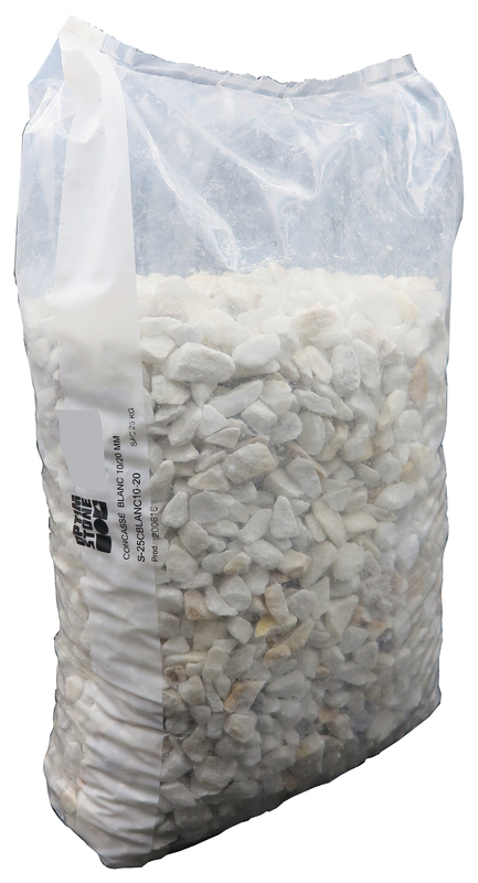 En marbre blanc concassé, calibre 10-20 mm Fabrication espagnole 25 kg - 0,20 € le kg Par 4 (100 kg) : 0,15 € le kg au lotGARANTIE 1 AN.