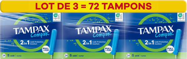 Tampons avec applicateur régulier TAMPAX le paquet de 36 - Les tampons Tampax Compak Régulier vous offrent une protection en toute discrétion pour les flux légers à moyens. Ils sont sans parfum et sans colorant. Les tampons Tampax Compak possèdent un applicateur en plastique compact et discret et sont dotés d’un embout arrondi pour une insertion facile et confortable
