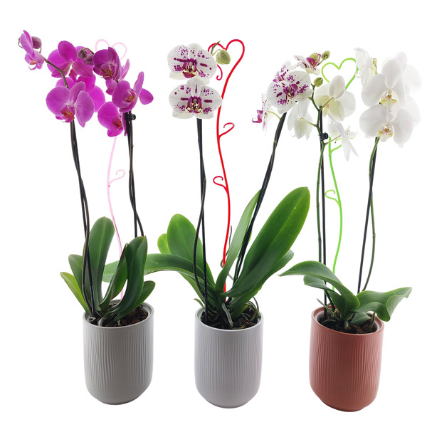 2 tiges avec cache pot céramique diamètre 12 cm. Différents coloris. - Existe aussi en mini orchidée : 4,99 €, orchidée "mère-fille" : 17,99 €, vase : 17,99 € et autres modèles à des prix différents. Existe aussi en 3 tiges : 14,99 €.