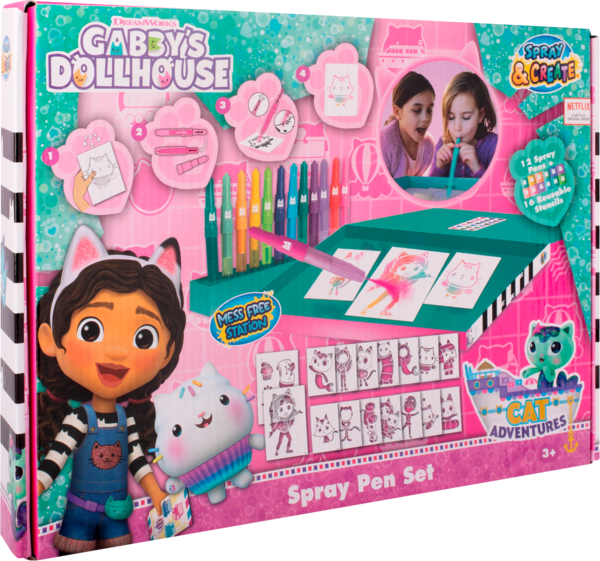 Set de 12 feutres souffleurs + 14 pochoirs A5, 2 pochoirs A4, de feuilles blanches à dessiner A4 et A5 et un pupitre Gabby Dollhouse. - Offre valable du 22/10/2024 au 08/12/2024.