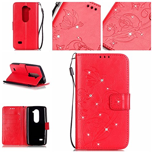 B01INB3N0G de Diamond pu cuir case etui - multi-function fermeture magnetique housse couverture - flip livre design de premium luxe synthetique cover hull - stand support et carte de credit slots coquille couvrir pour lg leon c40 h340n h340 coque,papillon fleur gaufré - rouge