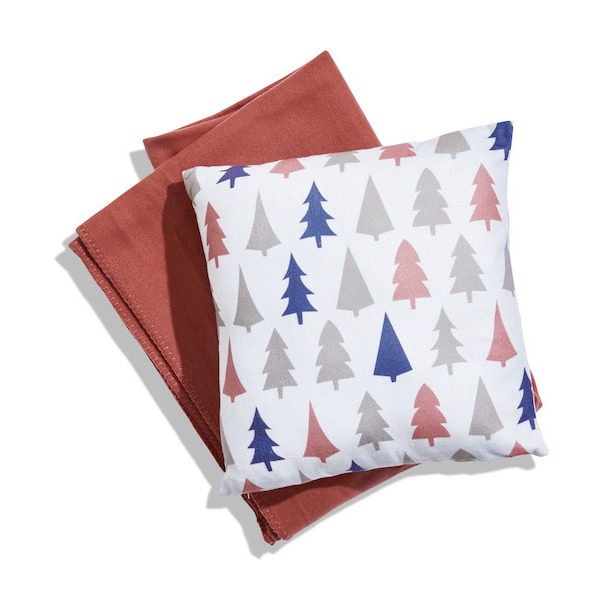 Plaid molleton 100% polyester. Coussin. Housse de coussin 100% coton. Enveloppe intérieure 100% polypropylène. Garnissage 100% polyester. Rouge ou gris. .