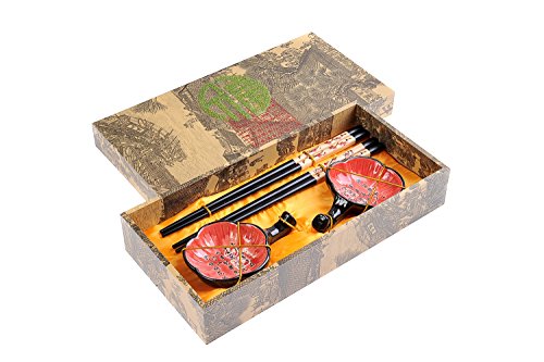 Luxueux coffret de décoration : Elegantes baguettes asiatiques en bois. Repose-baguettes inclus Livré dans un coffret cadeau de décoration de grande qualité qui peut également être utilisé comme décoration. Dimensions de la boite: 28cm x 14cm x 5cm Un merveilleux cadeau pour des amis ou la famille - et même pour soi-même !