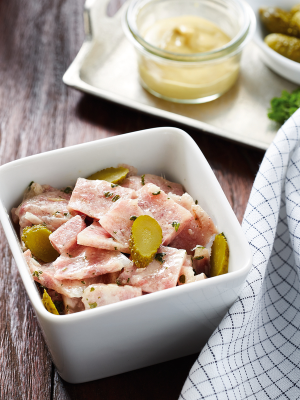 ou cervelas en sauce ou piémontaise (également disponibles au rayon frais emballé à 1.95€ la barquette de cervelas en sauce LE KG ou museau de porc - 300g - 6.50€ le kg)