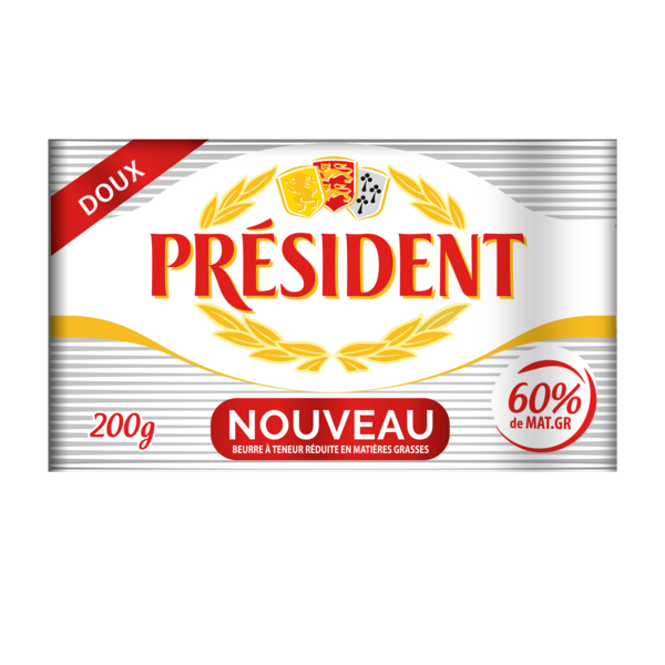 Choisissez le beurre PRÉSIDENT pour une qualité inégalée. Fabriqué en France, ce beurre doux ou demi-sel, à teneur réduite en matières grasses, contient 60% de MG et est conditionné en format de 200g.