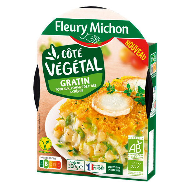 Choisissez la qualité avec Fleury Michon ! Dégustez les plats cuisinés Côté Végétal Bio, tels que le gratin de poireaux pommes de terre chèvre ou les pâtes façon bolognaise. Succombez également aux pavés de légumes chèvre accompagnés d'une onctueuse purée de courgettes. Tous nos produits sont fabriqués en France, pour une qualité garantie. Profitez de ces délicieuses saveurs végétales en format pratique de 300 g..