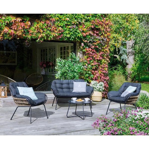 Le salon de jardin Siena Hyba se compose d'un canapé, de deux fauteuils et d'une table basse, le tout fabriqué en résine tressée de haute qualité. Ses coussins épais et confortables assurent un confort optimal pour vos moments de détente en plein air.