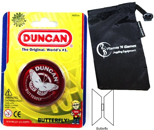 Duncan BUTTERFLY Yo-Yo. Classique vaste chaîne essieu forme yoyo + Flames N Games Voyages Bag. Ideal pour les débutants! Peut-être yo-yos les plus populaires de tous les temps, le papillon Duncan yo-yo ont ouvert la voie à une nouvelle ère de formes de yo-yo! Même maintenant (et peut-être dans le futur), tour de corde yo-yo utiliser une forme «aile» similaire. C'est le papillon Duncan ORIGINAL yo-yo, avec un axe fixe métallique et moitiés non modulaires. C'est un grand yo-yo pour commencer trucs d'apprentissage, et un grand soulagement du stress ainsi! Regardez à travers notre boutique Amazon pour toute une gamme massive de yoyos Pro et d'autres équipements de filature de jonglerie de cirque, jonglerie et le feu!.