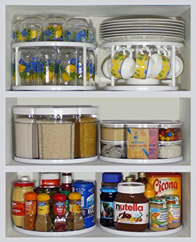 CAROUSSEL CASTEL -LOT-1- Equipement de cuisine tournant - Ce lot est composé de: - 2 plateaux simples 27 cm - 1 plateau double 27 cm, 1 porte-tasse 9 crochets 27 cm 1 ensemble de 6 boites de 105 cl avec plateau 27 cm et un ensemble PETIT Mélange avec 3 boites 67 cl et 6 boites 33 cl avec plateau 27 cm TRANSFORMATION TOTALE.Vous ne cherchez plus, vous tournez et l'arrière devient l'avant SANS FIXATION - simplement posés sur l'étagère Fabriqué en France - www.caroussel-castel.com.